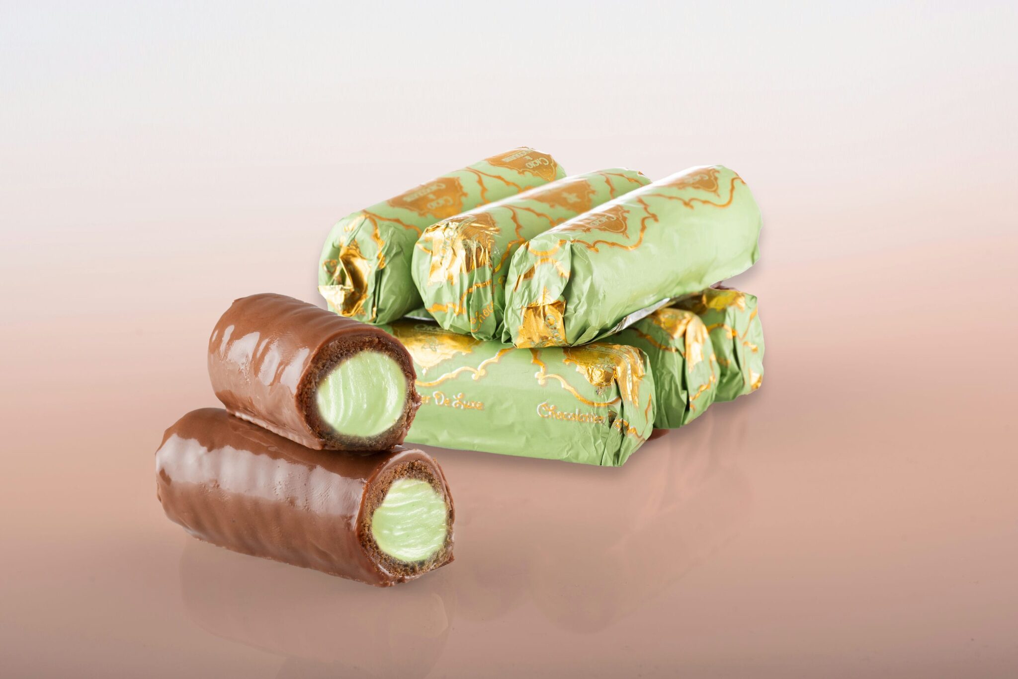 Biscuite Cigarillo umplute cu cremă de fistic, acoperite cu ciocolată cu lapte.