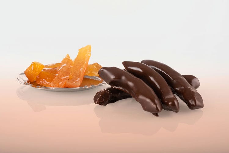 Baton de portocală acoperit cu ciocolată amăruie.